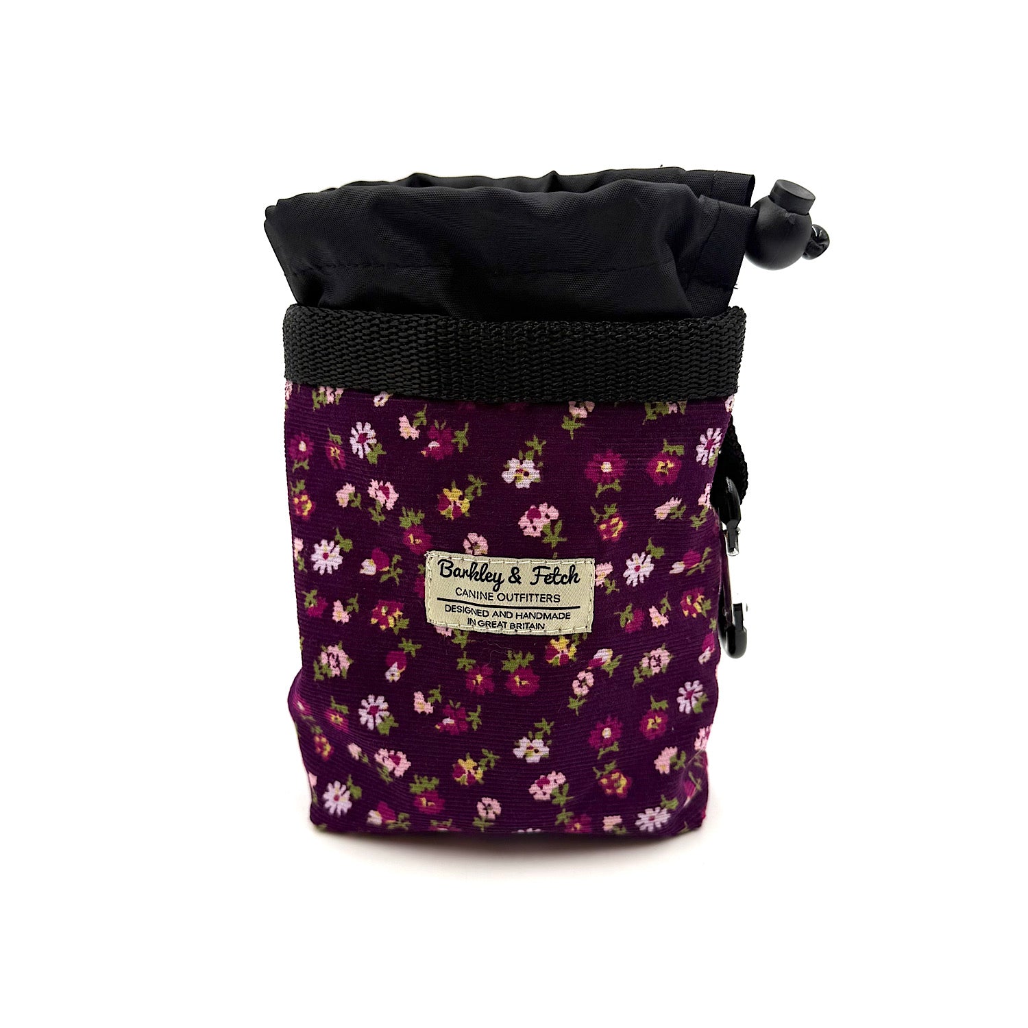 Treat Pouch with drawstring top, carabiner clip and water resistant lining.