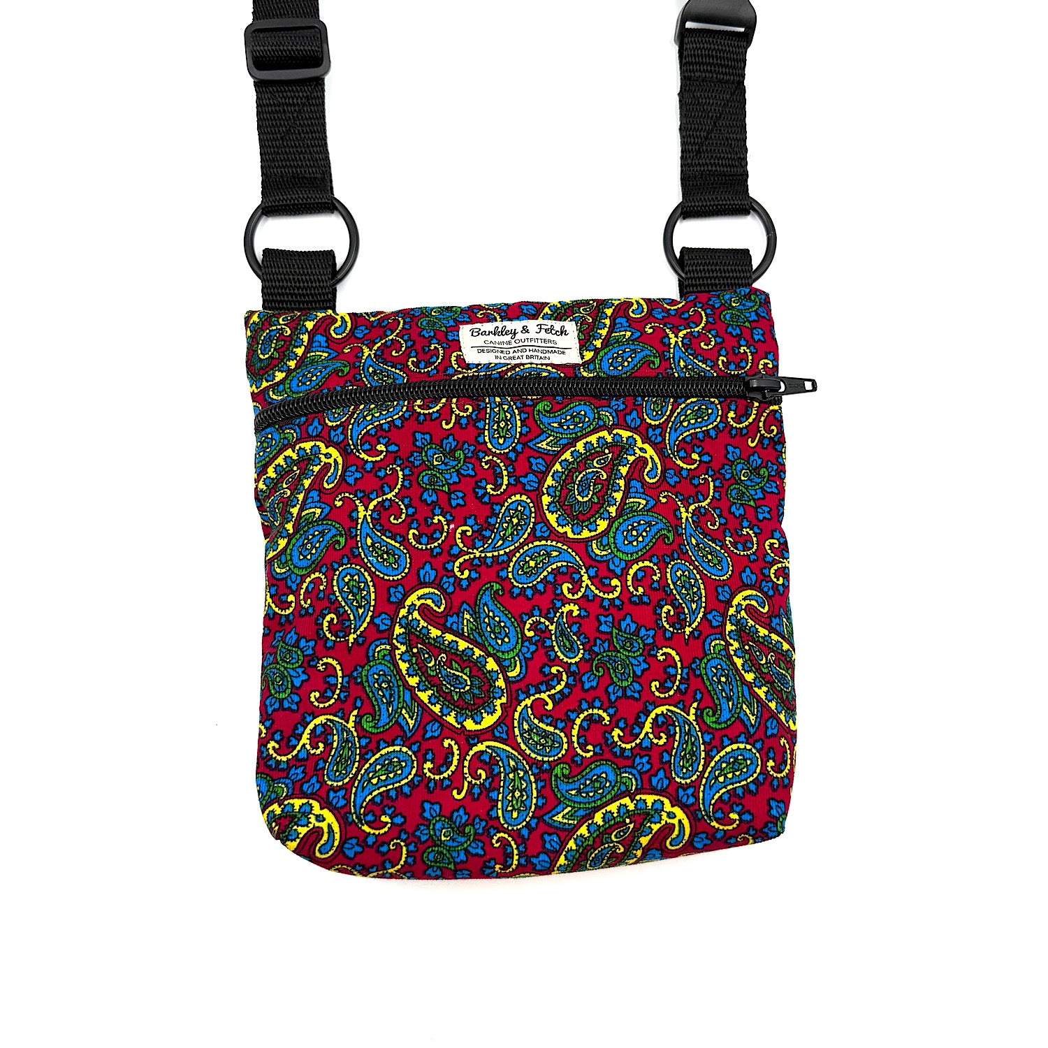Dog walking bag, can be worn across body or around the waist. Water resistant lining and quick-release buckle.